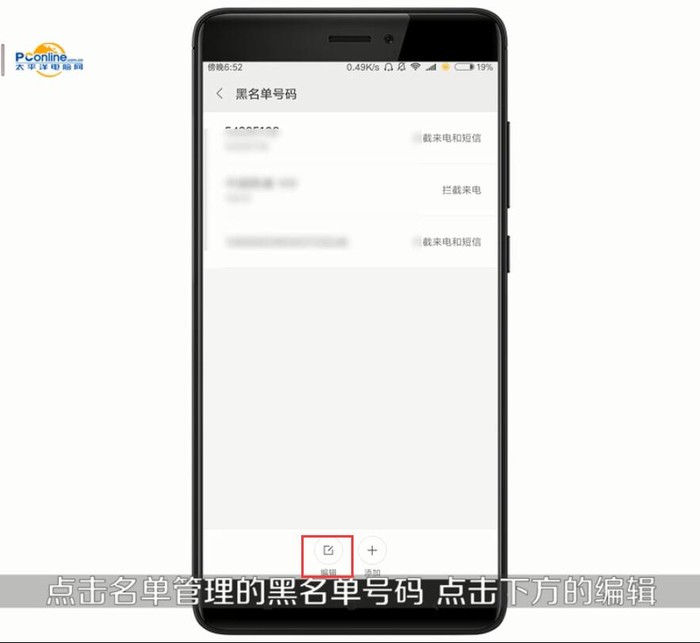 5、在该名单中可以看到被拦截的号码,点击下方的【编辑】按钮,将需要移出的号码选中点击【加白】或者【删除】即可移出黑名单;